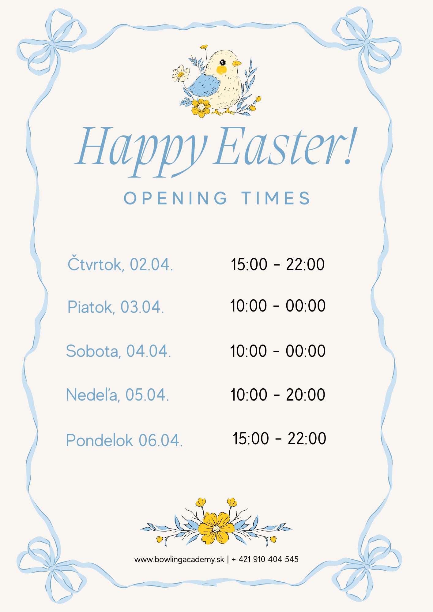 Pozrite si naše veľkonočné otváracie hodiny na obrázku a rezervujte si dráhu včas.